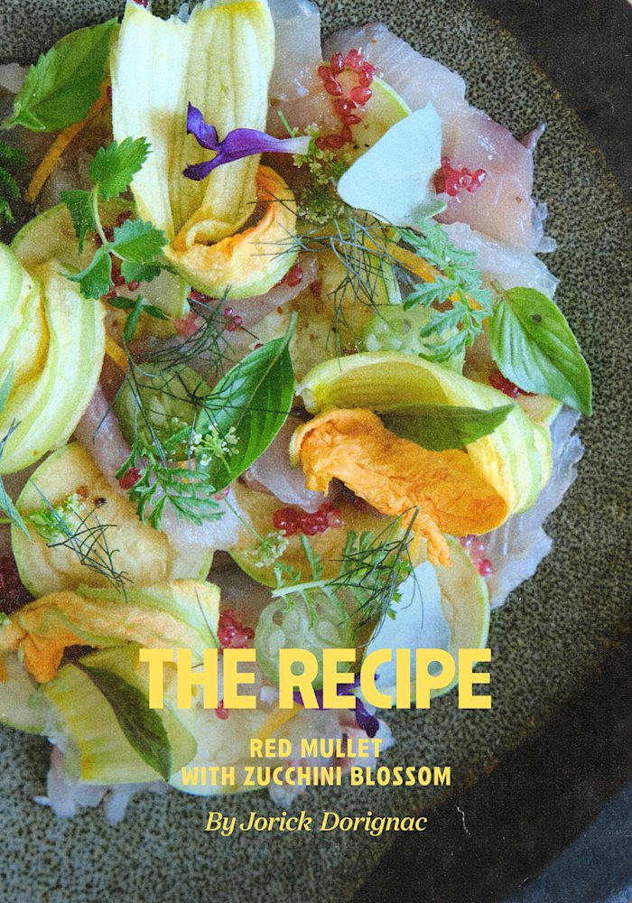 1. Start by filleting the red mullet and removing the pin bones. 2. In a blender, combine fine salt, brown sugar, marjoram, grated ginger, and citrus zest. 3. In a shallow dish, spread a layer of the marinade. Place the fillets on top, then cover with the remaining mixture. 4. Refrigerate for one hour. 5. After an hour, rinse the fillets under cold water and pat dry on a clean cloth. 6. Finely slice the zucchini, season with fleur de sel and Timut pepper. 7. Plate the dish by alternating thin slices of red mullet sashimi and zucchini blossoms. 8. Finish with a drizzle of olive oil and a squeeze of citrus juice.