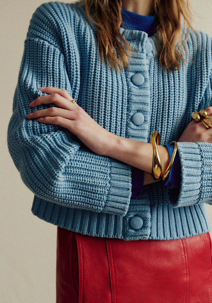 - Mother-of-pearl button closure at center front