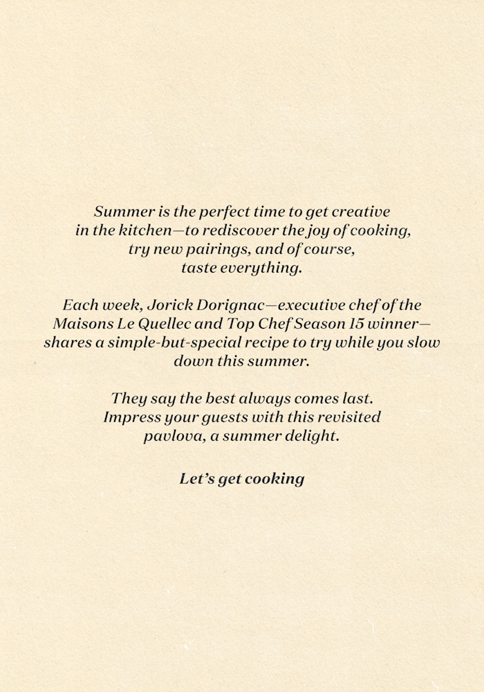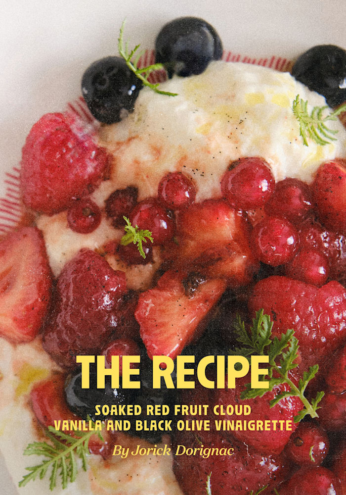 1. Blend the cream, egg whites, fromage blanc/ greek yogurt, and icing sugar until smooth. Pour into a siphon and charge with two gas cartridges. 2. Prepare a vanilla-infused syrup using the vanilla pod. Once lukewarm, pour over the berries and let them macerate for 2 hours. 3. For the vinaigrette, mix the olive oil, crushed olives, vanilla seeds, and a few drops of raspberry vinegar. 4. To plate: drain the berries (keep the syrup aside), spoon them onto the plate. Add a dollop of the fromage blanc/greek yogurt mix from the siphon. Drizzle with the vinaigrette and finish with a few lemon balm leaves.