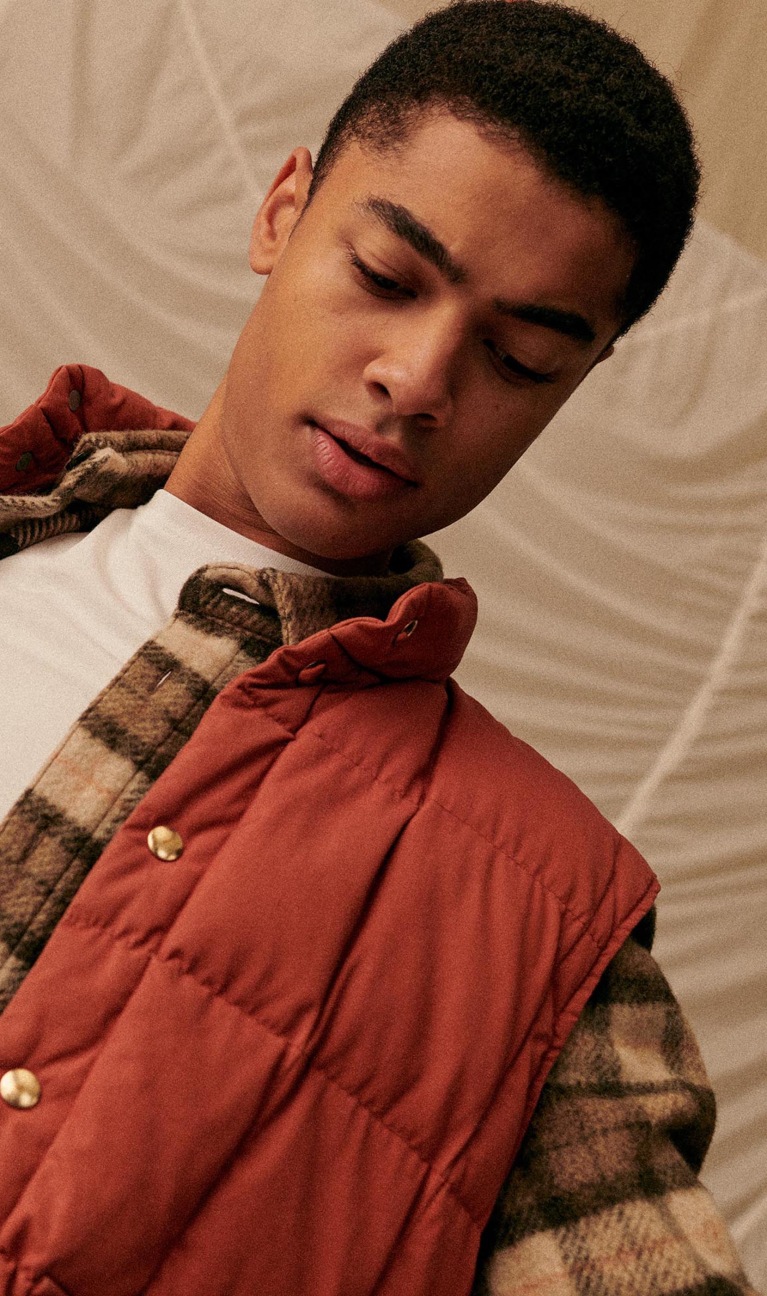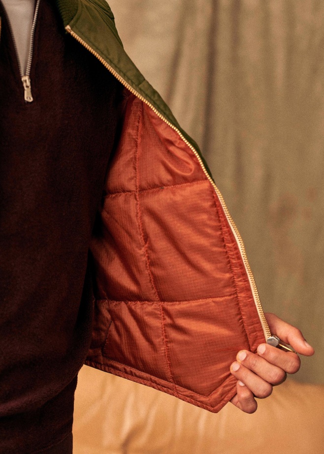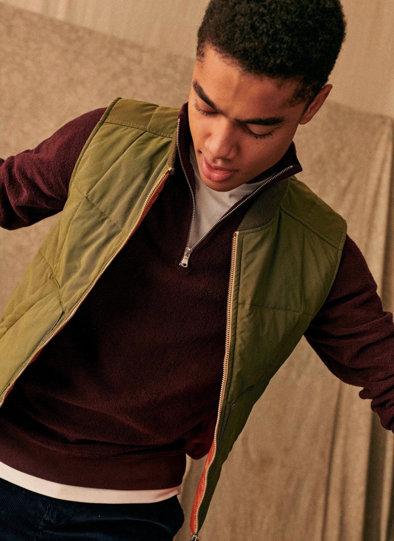 “The sleeveless cardigan is quilted with an army nylon. We like the idea of mixing pieces with different layers of clothing. It can be styled on top of a look to give it a vintage feel.”