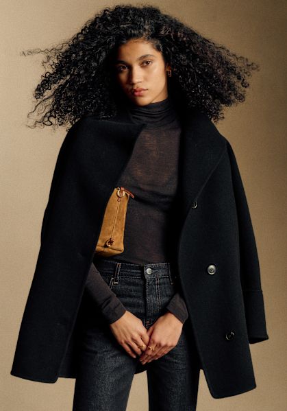 - Finitura a contrasto lungo lo scollo e la lista di abbottonatura