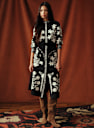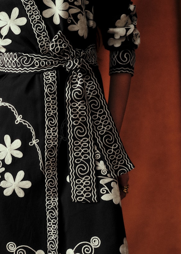 - De dekkende en symmetrische bloemenmotieven van jurk Vera zijn geïnspireerd op Matyó broderie en Hongaars vakmanschap.