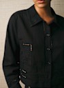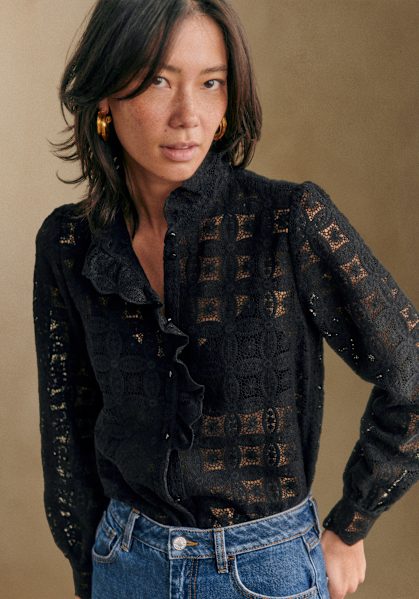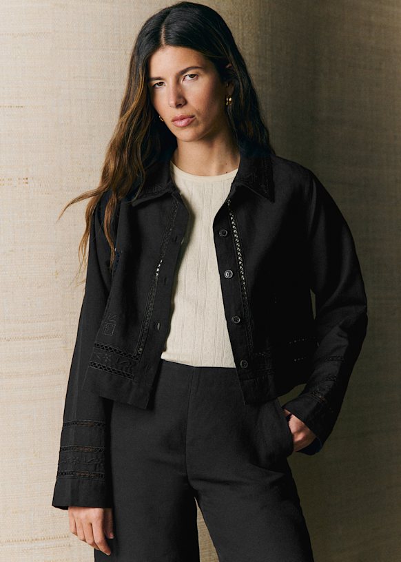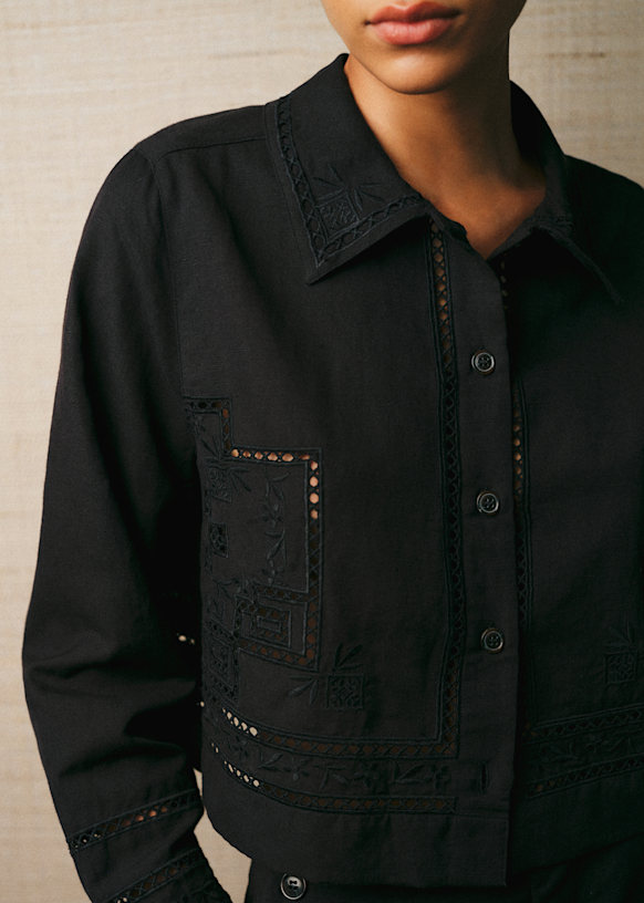 - Bordados aplicados e vazados na frente, na gola e nas mangas