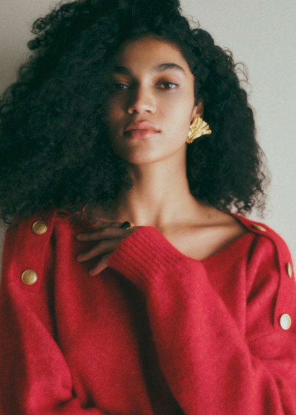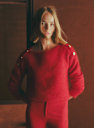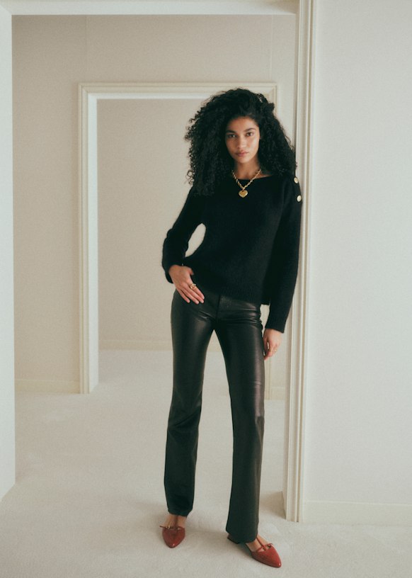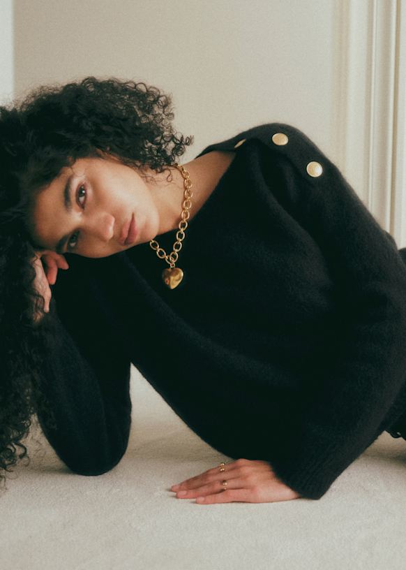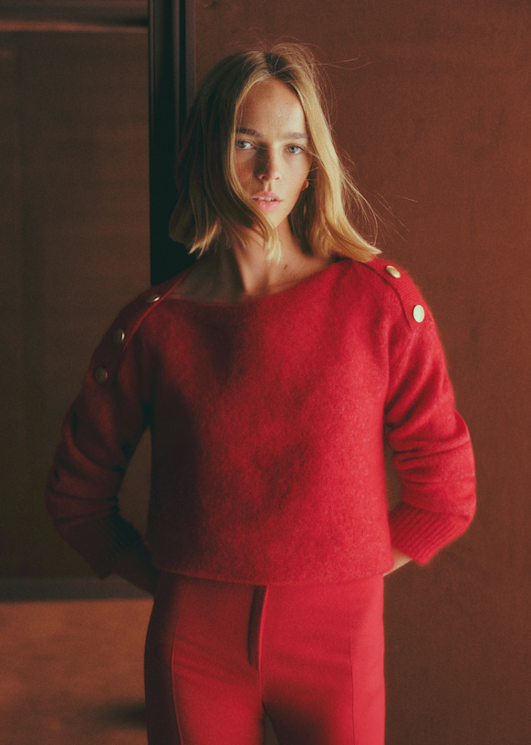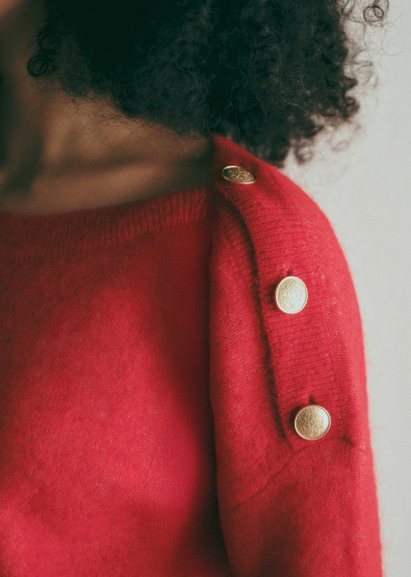 - Decote canoa que fecha com uma carcela de abotoamento nos ombros