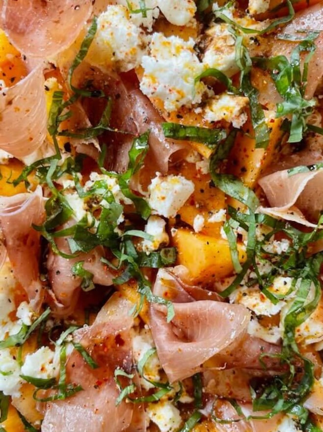 • Tear the thin slices of serrano for a more raw look and add it to the melon.